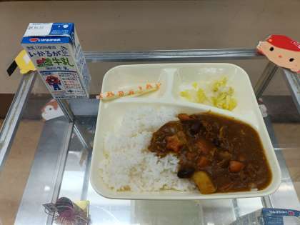 今日の献立は、「豚肉と金時豆のカレーライス」「牛乳」「白菜のピクルス」「棒チーズ」です。