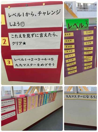 2年生の廊下に「九九チャレンジ」があります。九九マスター目指してがんばろう!!