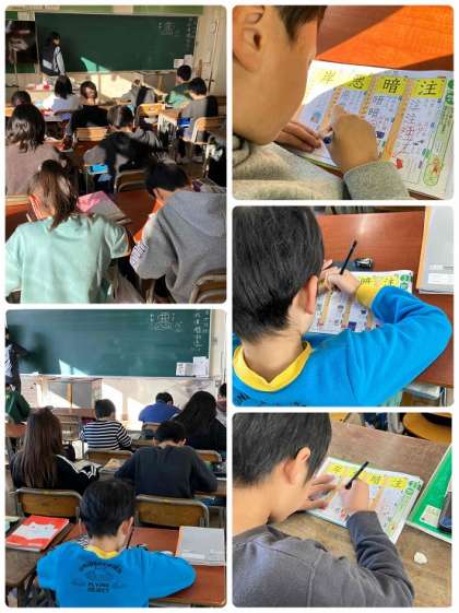 3年生の国語の時間です。今日の漢字は「悪」と「岸」です。書き順を確かめ、丁寧にしっかりと書き、集中して覚えています。