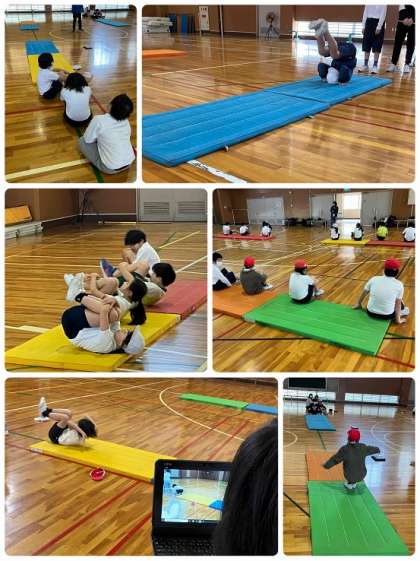 5年生の体育です。マット運動をしています。前転や後転などタブレットを使って、正しいフォームを研究し、お互いがアドバイスをしています。