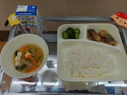 今日の献立は、「ご飯」「牛乳」「さばのカレー竜田揚げ」「五目汁」「きゅうりの甘酢和え」です。