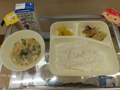 今日の献立は、「ご飯」「牛乳」「鶏肉の塩麴焼き」「かす汁」「栗きんとん」です。