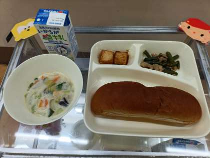 今日の献立は、「黒糖パン」「牛乳」「白菜のクリーム煮」「厚揚げのピリ辛醬油かけ」「豚肉とさんど豆のオイスターソース炒め」です。