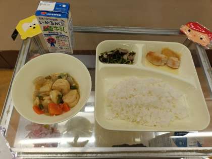 今日の献立は、「ご飯」「牛乳」「鶏肉のおろし醬油かけ」「水菜の煮浸し」「一口がんもとじゃがいもの味噌煮」です。