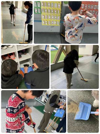 お昼の「そうじの時間」です。くつばこやろうかなど、自分の分担した場所を一生懸命に清掃しています。気持ちがよいですね。