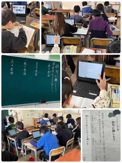 3年生の国語「俳句に親しもう」の学習です。今日は「五・七・五」の俳句作りです。春・夏・秋・冬の季語を調べ、作品作りに挑戦していました。
