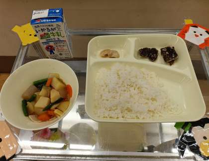 今日の献立は、「ご飯」「牛乳」「くじらの竜田揚げ」「豚肉とじゃがいもの煮物」「しろはな豆の煮物」です。