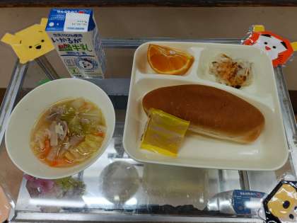 今日の献立は、「コッペパン」「アプリコットジャム」「牛乳」「押し麦のグラタン」「デコポン」です。