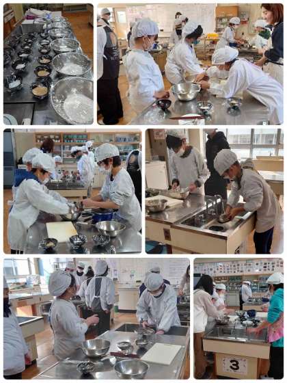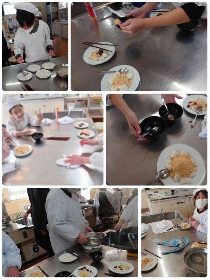 5年生の調理実習です。「いっしょにホットタイムしよう」をめあてに「白玉だんご」を作りました。慣れた手つきで役割を分担し、てきぱきと行動しています。