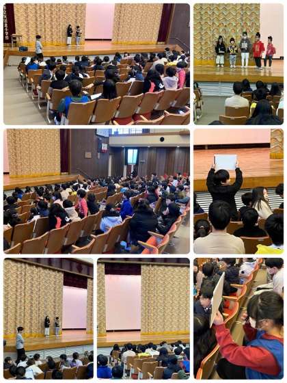 児童集会で、「UFOゲーム」をしました。幕と幕の間に何かが通ります。それが何かを当てるゲームです。みんな真剣に見ていました。子どもたちは、なかよし班で答えを考えました。