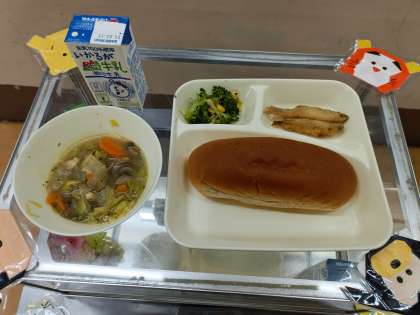 今日の献立は、「黒糖パン」「牛乳」「わかさぎフライ」「スープ煮」「ブロッコリー