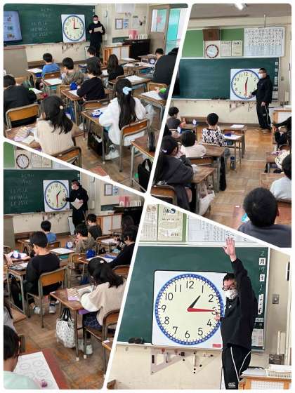 1年生の算数の学習です。時計の学習をしています。「なんじなんぷん?」みじかい針で何時がわかり、長い針で何分かがわかるようになりました。