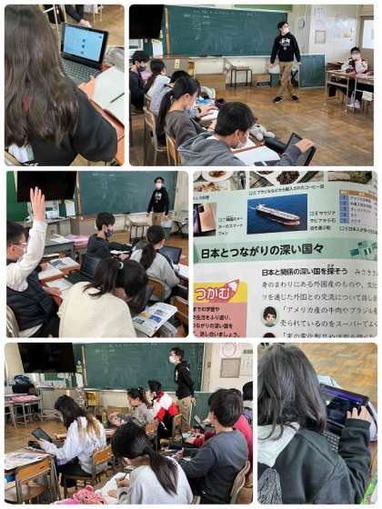 6年生の社会の学習です。「日本とつながりの深い国々」の単元で、中国やアメリカなど、貿易や観光など、関わり合いの深い国について調べています。