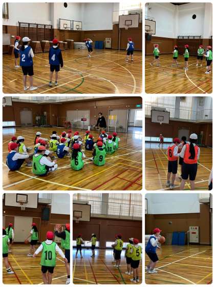 6年生の体育です。「バスケットボール」の学習を進めています。シュート練習やドリブル練習をして、いよいと試合に入ります。白熱した試合になりそうです。