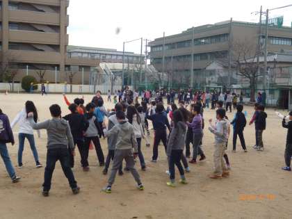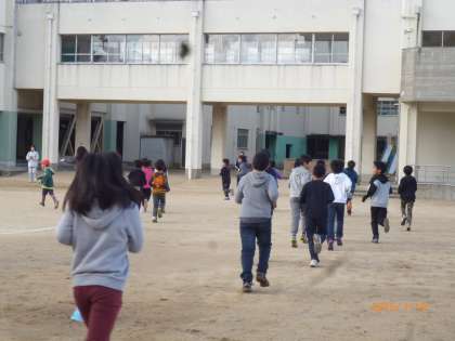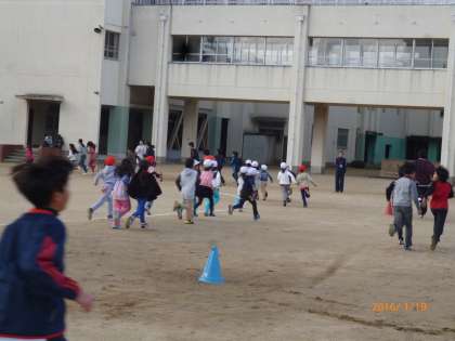 今年一番の寒さの中、全校児童が元気一杯に運動場を走りました。