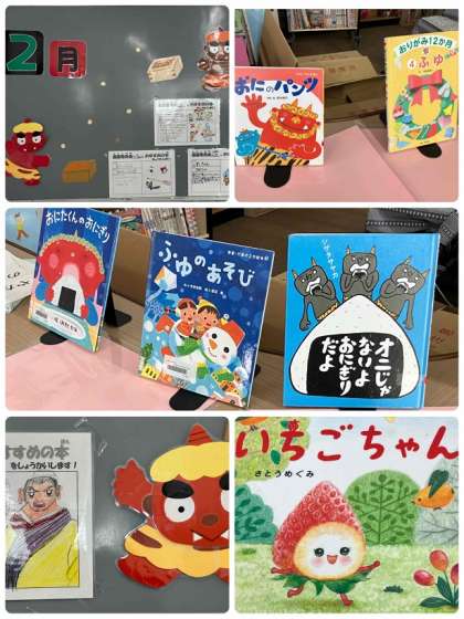 2月の図書室です。今回は、「冬や2月に関する本」を集めてみました!!「ふゆのあそび」「オニじゃないよおにぎりだよ」「おにたくんのおにぎり」「おにのパンツ」など、楽しそうな本がたくさんあります。・・・