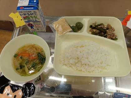 今日の献立は、「ご飯」「牛乳」「豚肉と野菜の炒め物」「五目汁」「よもぎだんご(きなこ)」です。