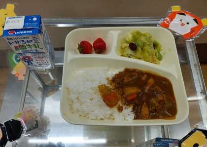 今日の献立は、「チキンカレーライス」「牛乳」「ビーンズサラダ」「いちご」です。