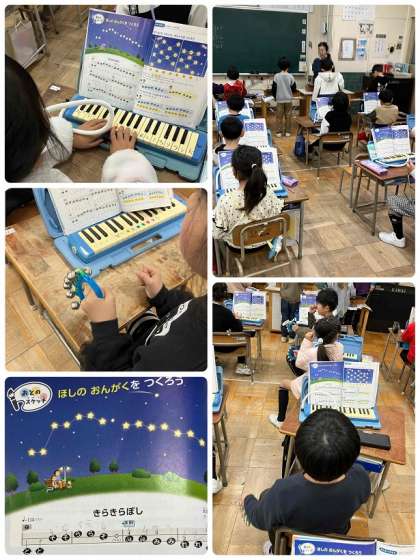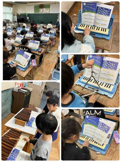1年生の音楽です。「きらきらぼし」の合奏をしています。鍵盤ハーモニカや木琴、鉄琴、トライアングル、鈴など、様々な楽器をみんなで交代で演奏しました。