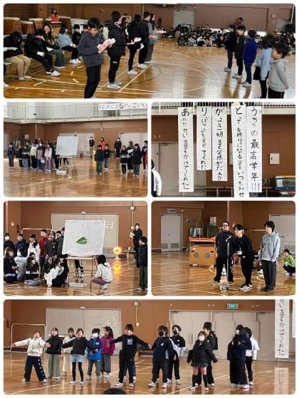 児童会が中心となって、卒業おめでとう集会が開かれました。もうすぐ卒業する6年生に「学校全体の見本で いつもやさしくしてくれてありがとう」をテーマにそれぞれの学年が、合奏や歌、呼びかけをしました。