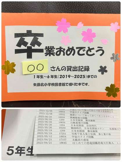 6年生の卒業を祝い、図書司書が貸出記録を記録をまとめました。1年生から6年生の6年間で図書館で借りた本を記録しています。たくさん読んだね。中学校でもどんどん読書に挑戦してくださいね。