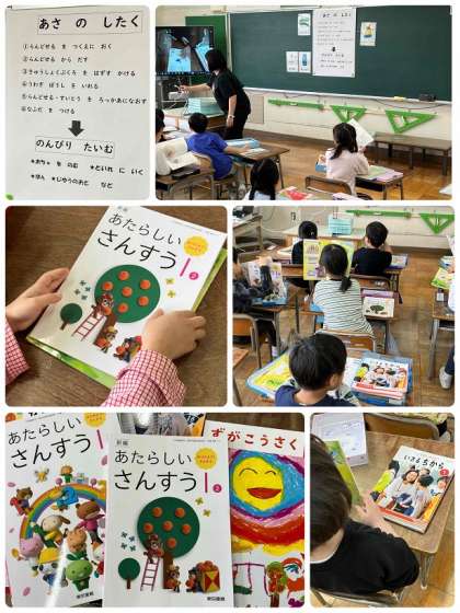 1年生の教室を見てみると・・・。「あさのしたく」の学習をしていました。学校に来てから、どのように準備をするのか、一つずつ確認しています。新しい教科書も確認しました。自分で準備できるように頑張りましょう。