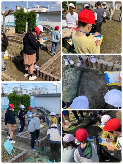 4年生の理科の学習です。学習園や校庭に出て、「春」を探しています。「虫」や「草花」をみて、スケッチしています。