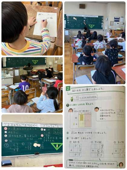 2年生の算数です。今日は「ひっさんの仕方を考えよう」をめあてに学習を進めました。たしざんのひっさんは、くらいをそろえることが大切だとわかりました。