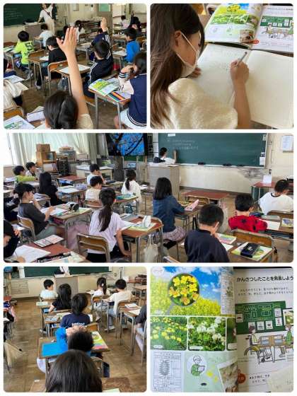 前回の授業で、校庭の観察をしました。今日はその発表です。草花や虫を発見したことについて、みんなで発表しました。