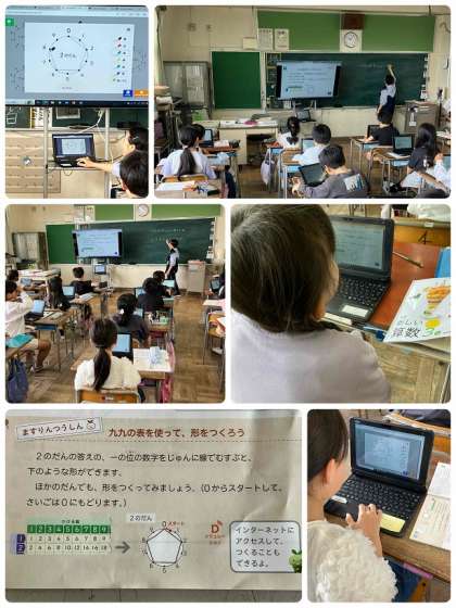 3年生の算数の時間です。「九九の表を使って、形を作ろう」の学習です。九九の答えを一の位を線で結ぶと色々な形が現れてきます。タブレットを使用し、様々な段の答えで形を作りました。