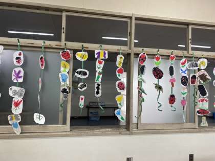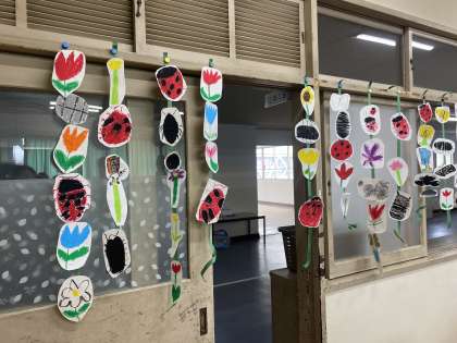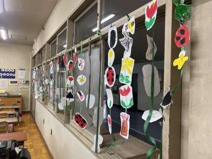 完成した飾りは教室に飾り、素敵な教室が出来上がりました。友だちの作品を見合って、「これテントウムシやん!」「かわいい!」などと感想を伝え合っていましたよ♪(5月9日 記事)