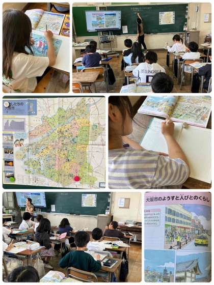 3年生の社会科の学習です。「大阪市のようすと人々のくらし」の単元で、大阪市の有名なものについて考えました。ハルカス、海遊館、大阪城など、たくさん意見が出ました。