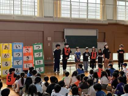 児童集会終わりに代表委員会の児童が、来週から始まるあいさつ週間について、全校児童の前で啓発運動をしました。