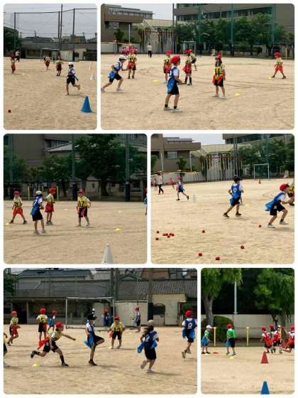 2年生の体育です。「宝はこびおに」というゲームをしています。みんな全力で走り回っています。