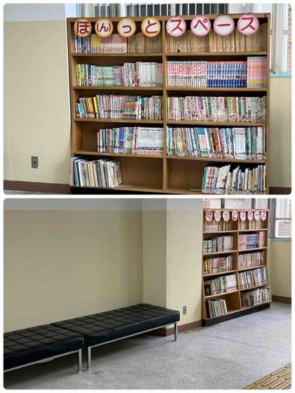 南校舎1階にあった「ほっとスペース」を中校舎1階へ移動しました。休み時間や放課後に「ほっと」しながら「ほん(本)」にふれあうことができればと考えています。