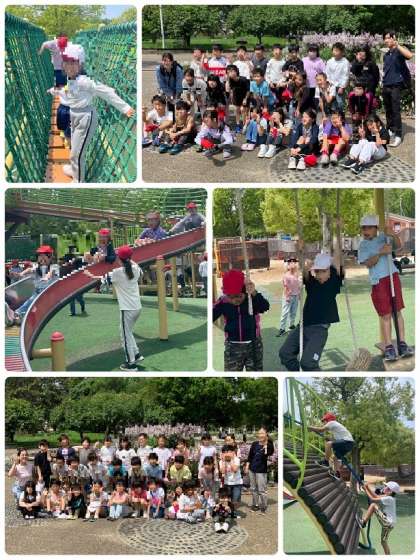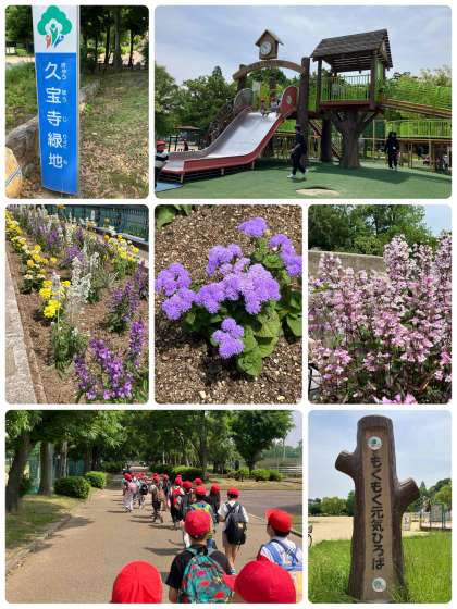 公園に行く途中、花壇にきれいな花がたくさん咲いており、ほっと一息できました。公園には、すべり台や遊具があり、楽しく遊びました。すべり台やブランコ、おにごっごなど、みんな元気に体を動かしました。