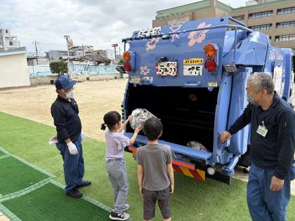 実際にパッカー車にごみ袋を投入して動きを見たり、運転席に乗せてもらったりしました。また、どの音楽が流れていると何のごみを回収するのかをクイズで楽しく学習しました。