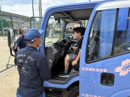 今日は、パッカー車の体験授業です。大阪市環境事業局の方から、パッカー車やごみの分別について教えていただきました。