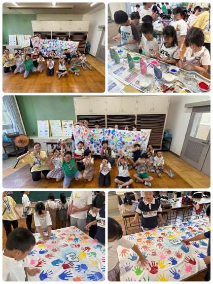 WCC(ワールド・コネクション・クラブ)では、新しく旗に手形をつけました。世界の文化や言語について、しっかり学習して、交流していきましょう。