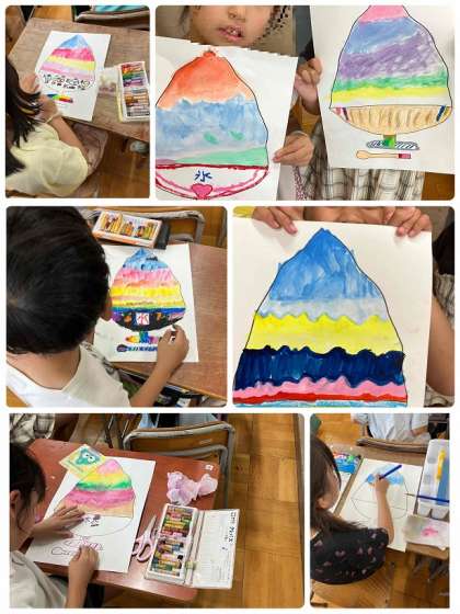 2年生の図工の時間です。夏の風物詩「かき氷」を描きました。どのかき氷も冷たくて、とてもおいしそうですね。