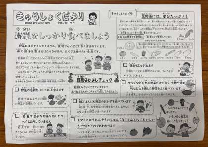 夏野菜には水分がたっぷりと入っています。給食だよりにも掲載されていますが、今月の給食に【かぼちゃ・トマト・オクラ・ピーマン・ゴーヤ・きゅうり・なす・とうがん】が登場しています。いつ登場しているのか皆さんも考えながら給食を食べてみてくださいね。また、暑い日が続く夏休みですが、おうちでも夏野菜をしっかりと食べて暑い夏を乗り切りましょう!