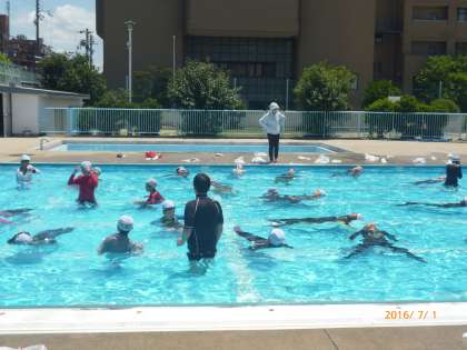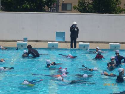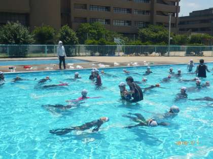 3時間目 高学年のプール学習の様子です。今日は、着衣泳をしました。ペットボトルを持って、みんなが浮いています。