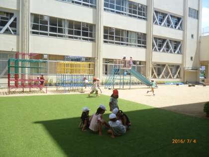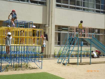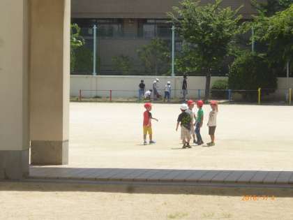 暑さにも負けず、子ども達は元気に中庭や運動場で遊んでいます。ドッジボールや追いかけっこ、セミを観察している子ども達もいます。20分休みの様子です。