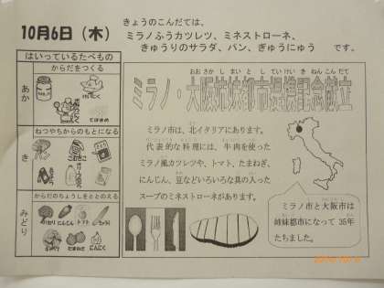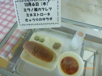 今日の献立は、ミラノふうカツレツ、ミネストローネ、きゅうりのサラダ、パン、牛乳です。ミラノ市と大阪市は、姉妹都市になって35年たちました。