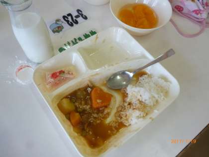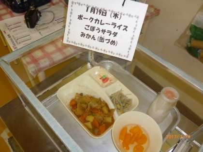 今日の献立です。ハート型のにんじんが入っていたら、給食調理員さんからカードのプレゼントがあります。