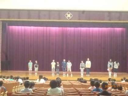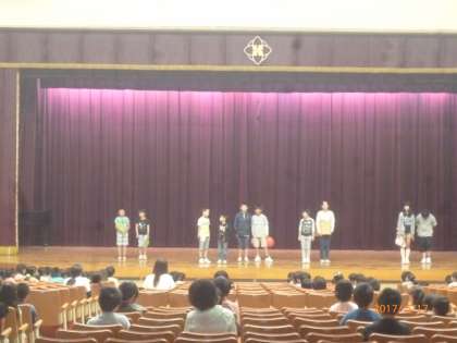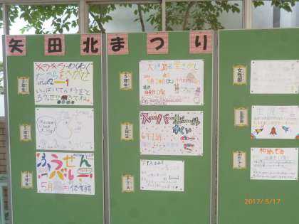 児童集会で、矢田北まつりのお店紹介がありました。土曜日に向け、みんなが力を合わせて準備中です。