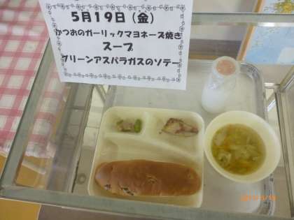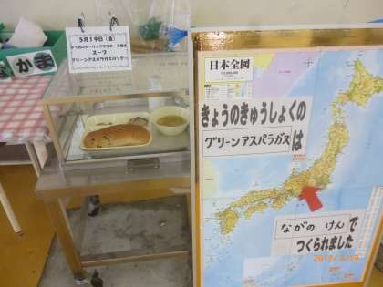 毎月19日は、食育の日です。今日の給食には、長野県産のグリーンアスパラガスが使われています。感謝の気持ちを込めて「いただきます」