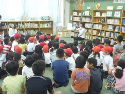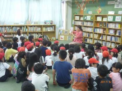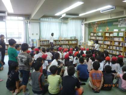 矢田北お話Boxの皆さんに、絵本の読み聞かせをしていただきました。雨で運動場が使えません。いつもよりたくさんのお友達が集まりました。