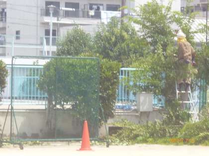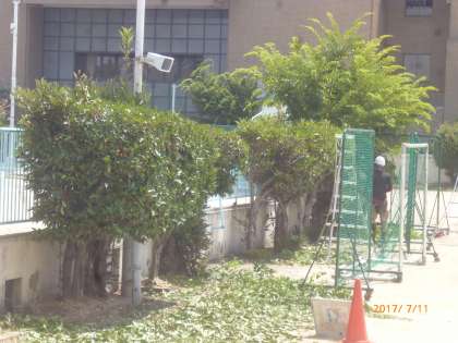 猛暑の中、業者のみなさんが剪定してくださっています。
