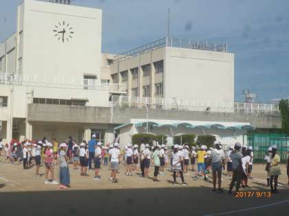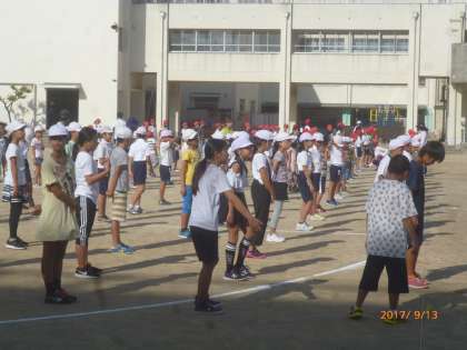 運動場で運動会の隊形を確認しました。